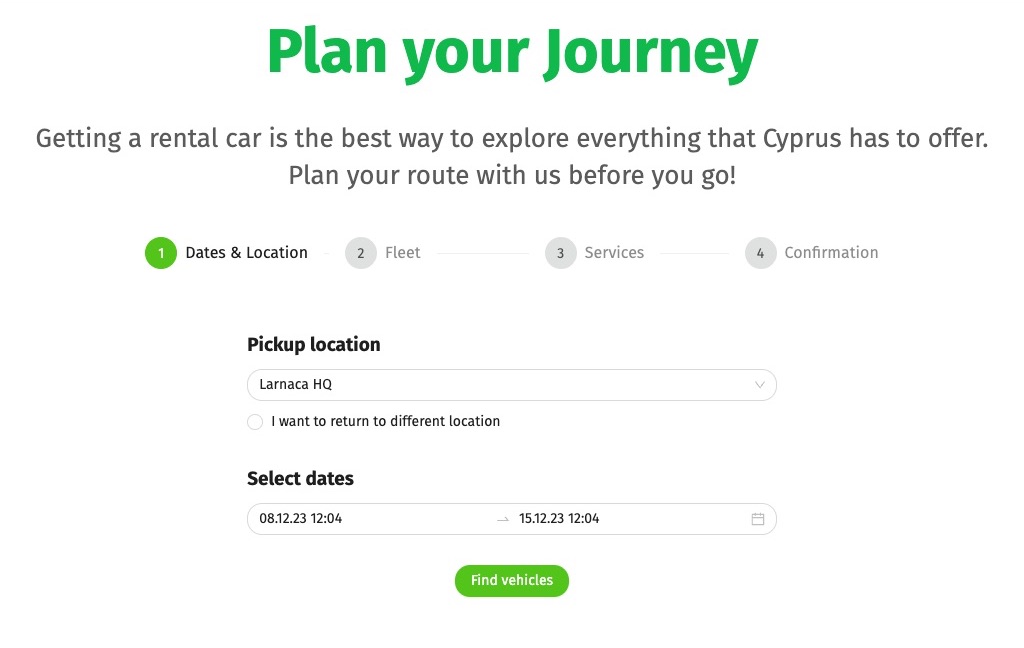 اختيار تفاصيل التأجير\الاستئجار، مثل التواريخ وأماكن استقلال السيارة\إرجاع السيارة