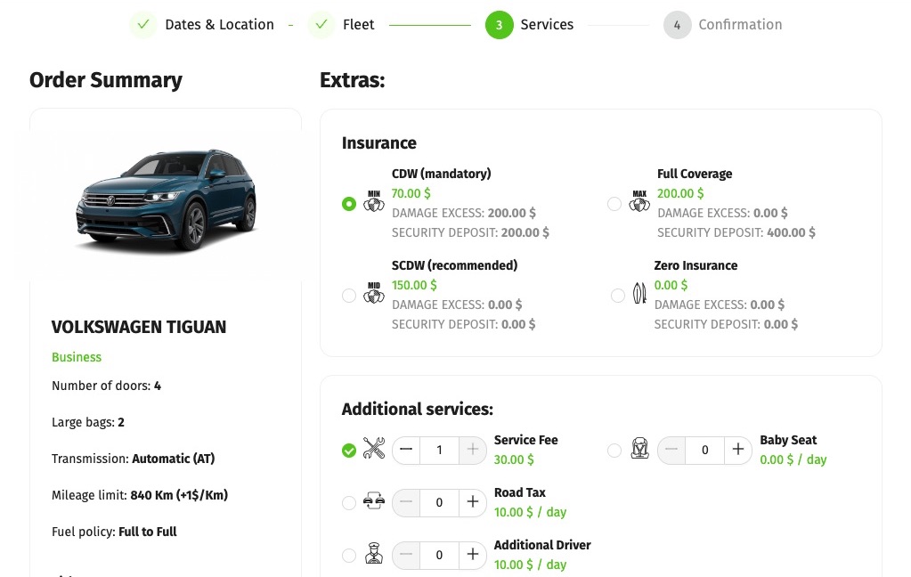 การเลือกรายละเอียดการเช่า เช่น วันที่และสถานที่รับ/คืนรถ